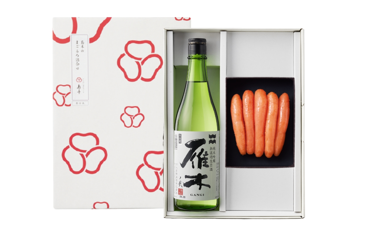 希少な噴火湾辛子明太子と八百新酒造の純米吟醸「雁木ノ弐」の贅沢な詰合せ。